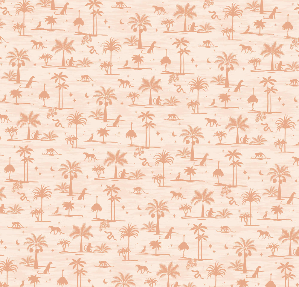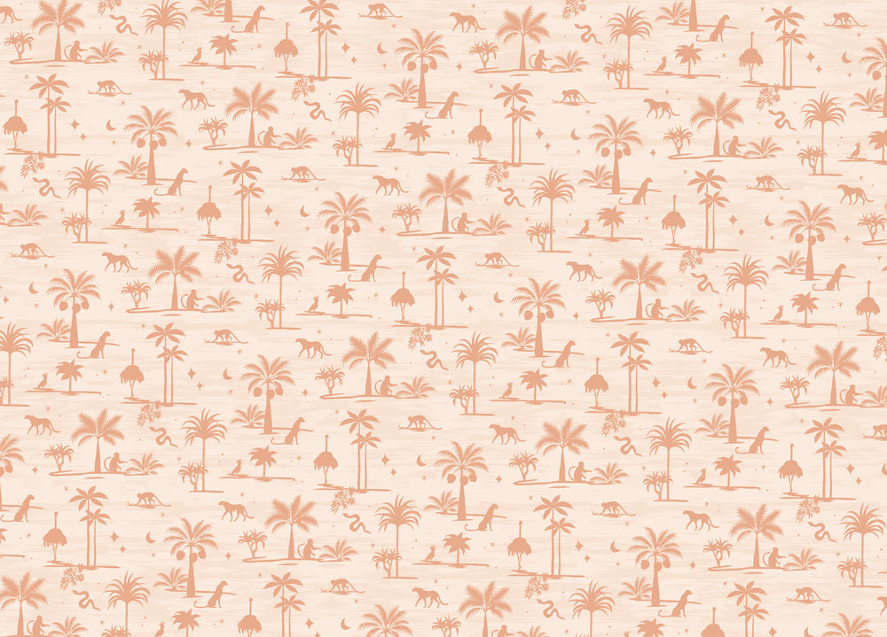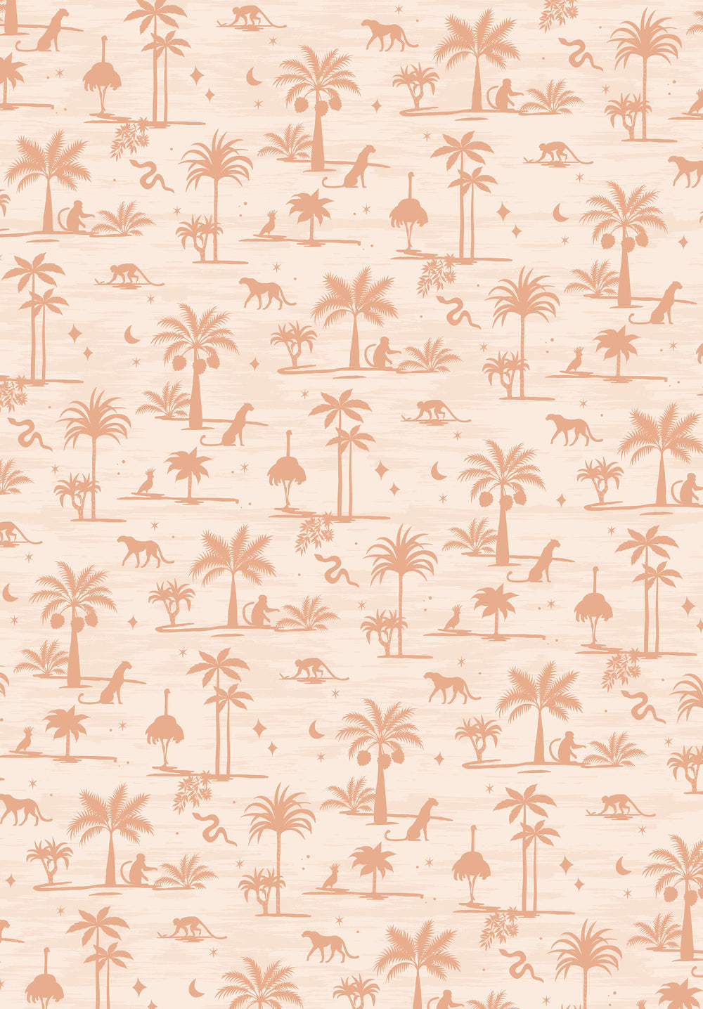 Dieses elegante Tapetendesign von Creative Lab Amsterdam zeigt rosa Dschungel-Silhouetten auf einem pastellfarbenen Hintergrund.