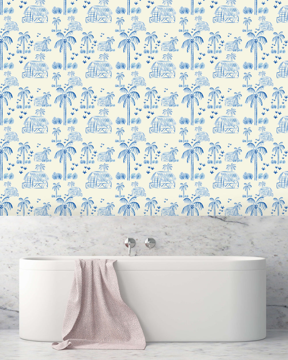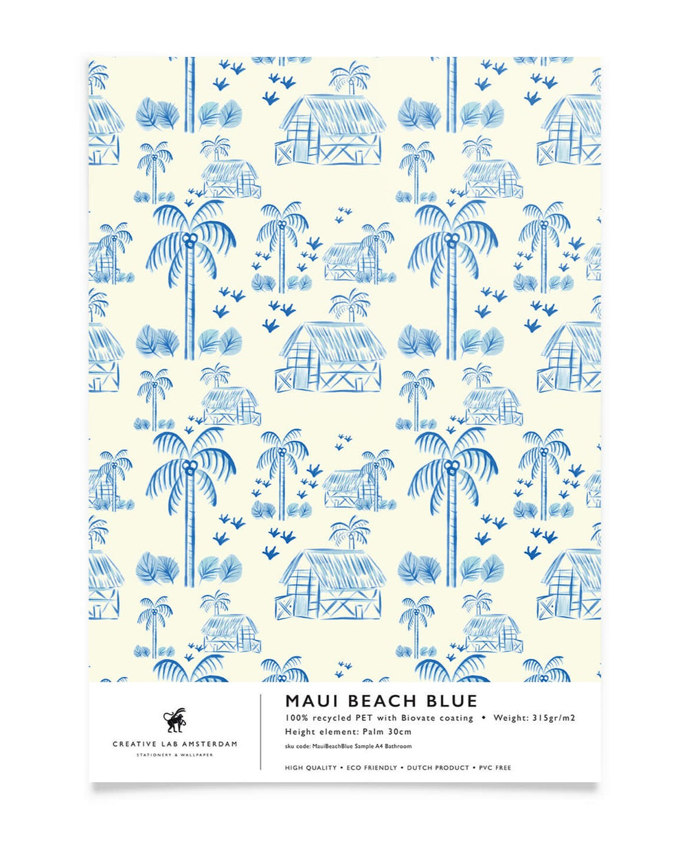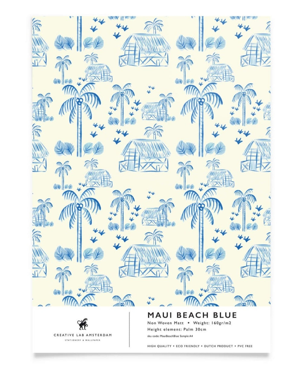 Bitte beachten: Die Elemente auf diesem Maui Beach Blue-Muster entsprechen nicht der tatsächlichen Größe. Die Höhe der Palme beträgt 30 cm.