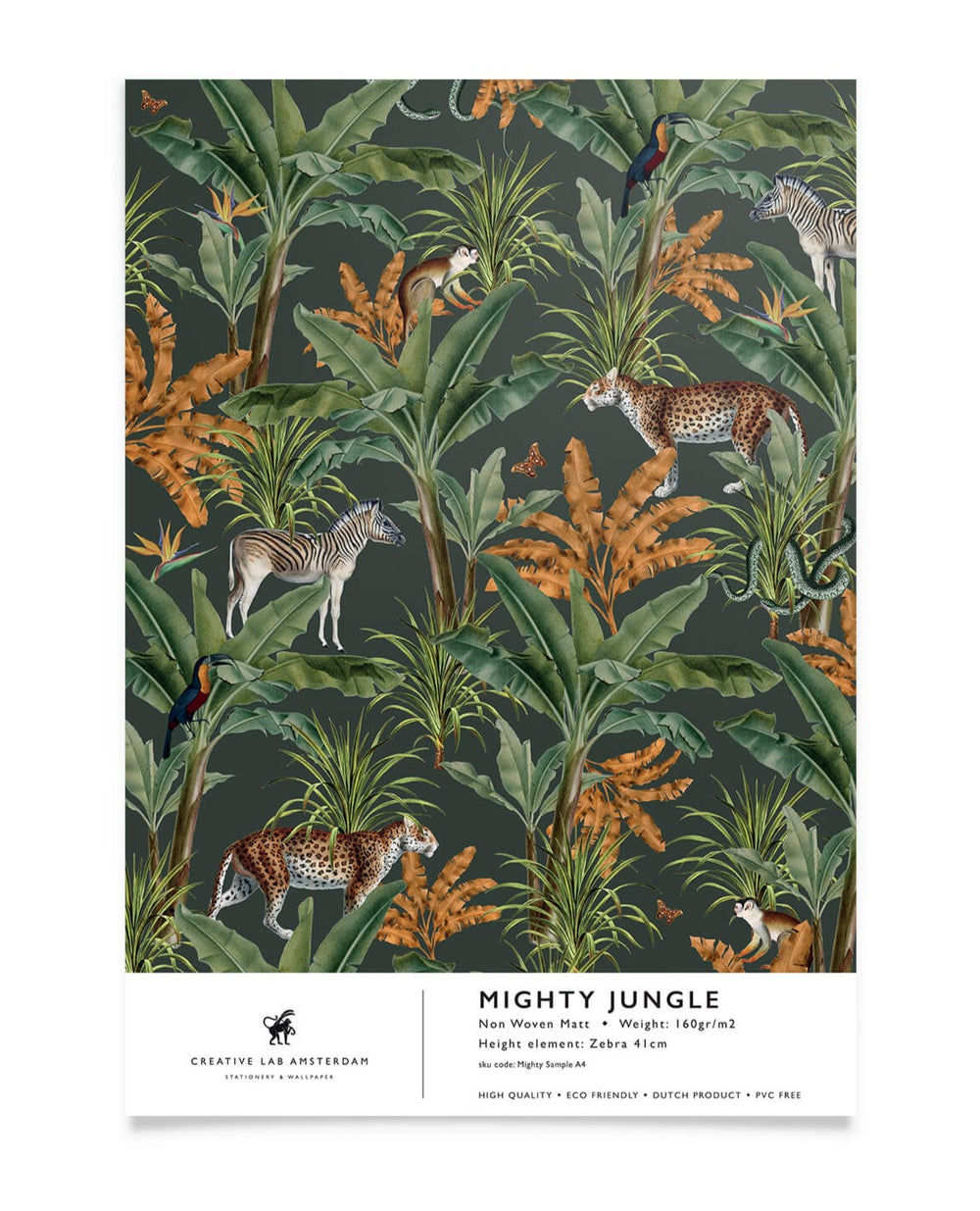 Bitte beachten: Die Elemente auf diesem Tapetenmuster „Mighty Jungle“ entsprechen nicht der Originalgröße. Die Höhe des Zebras in diesem Design beträgt 41 cm.