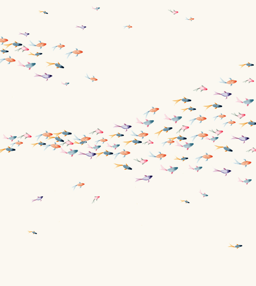 Tapetendesign in Naturtönen mit herumschwimmenden kleinen Fischen.