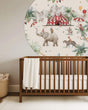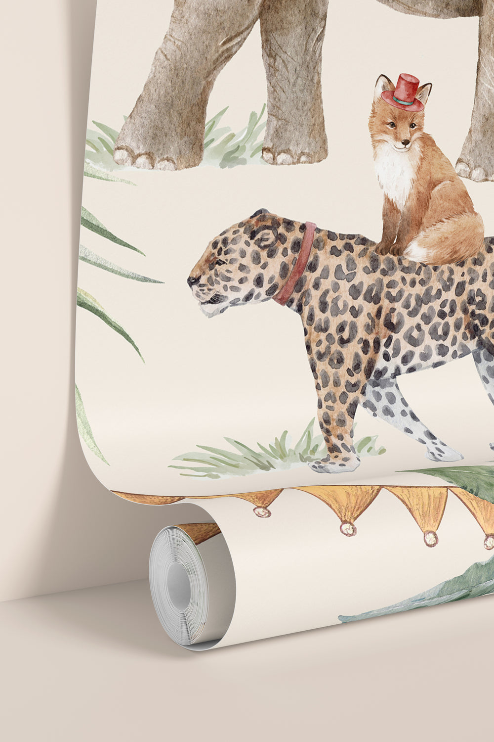 Het carnaval is begonnen en alle dieren zijn klaar voor de parade! Voorop lopen de olifant en het aapje op zijn rug, gevolgd door de tijger, muis en nog een brutale aap die door de bomen slingert. Al snel gaat het feest verder in de grote feesttent. Met zijn zachte kleuren en vrolijke thema is deze behang perfect voor elke kinderkamer – van heel jong tot iets ouder – en brengt een speelse en feestelijke sfeer op de muren.