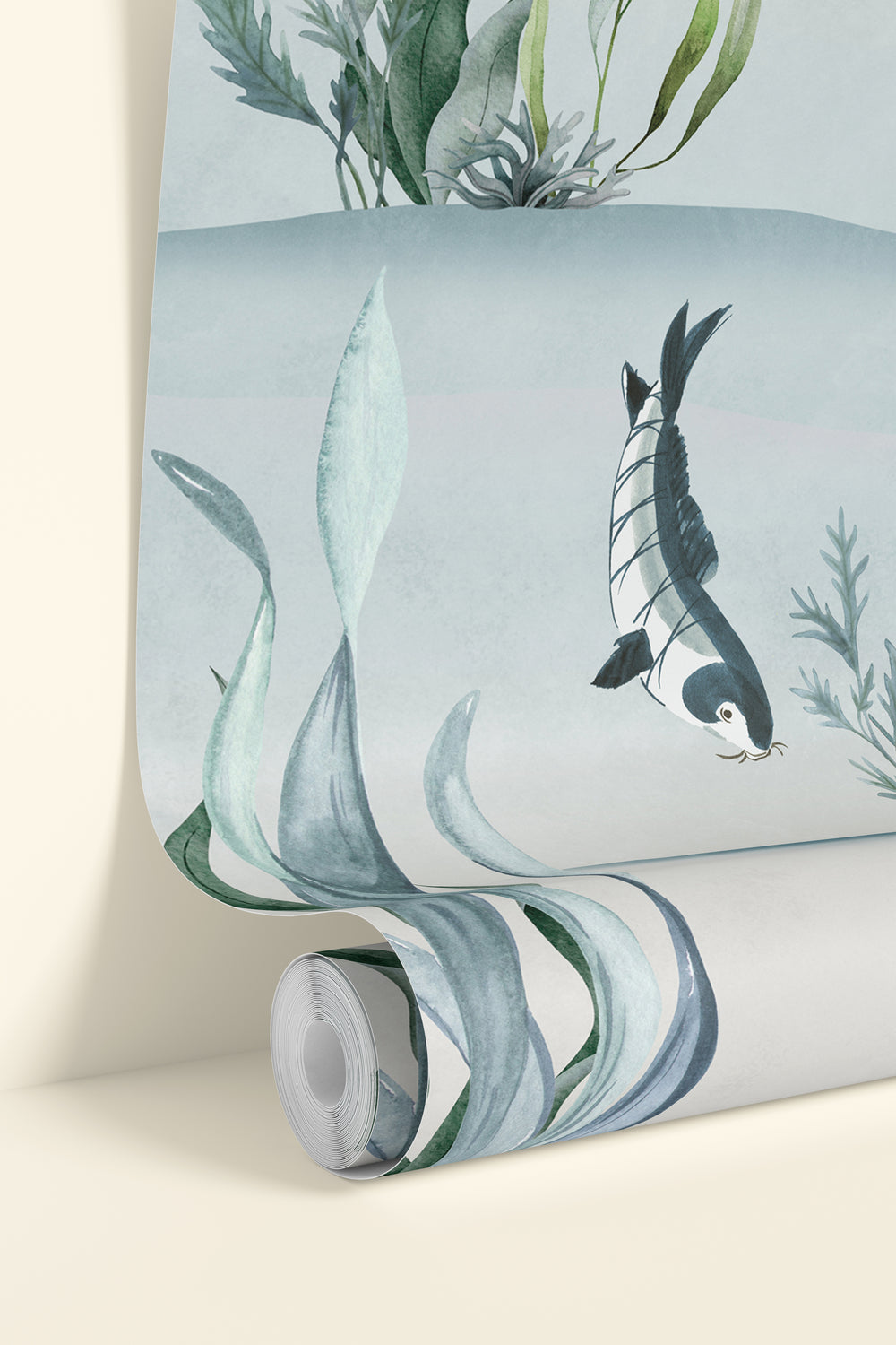 Dompel jezelf onder in de betoverende wereld van de lelievijver, vol vissen, kikkers en andere onderwaterwezens. Dit elegante ontwerp, in zachte en rustgevende blauw tinten, brengt een serene en tijdloze schoonheid in elke kamer. Een perfecte keuze voor het creëren van een verfijnde en klassieke sfeer in je hele huis.